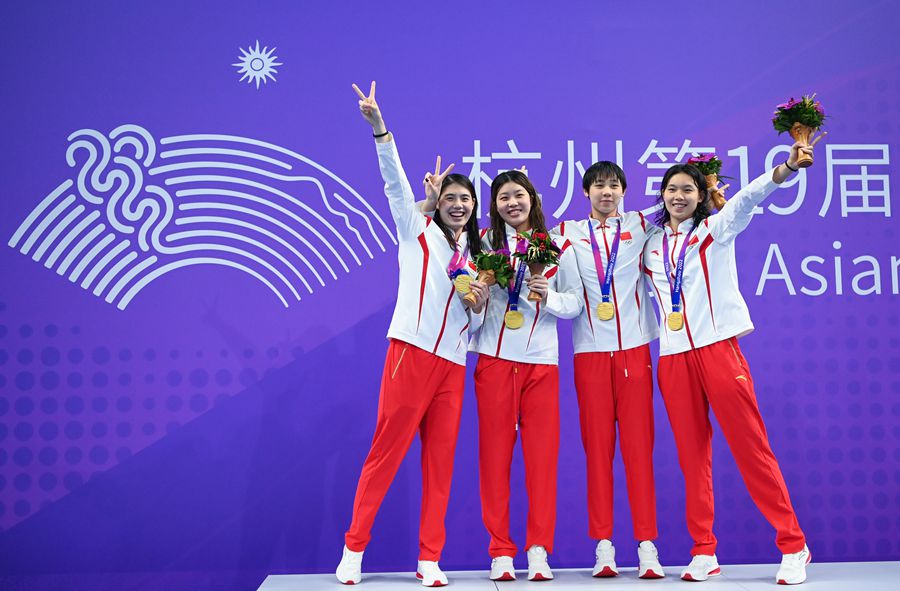 9月24日,女子4x100米自由泳接力決賽,由楊?,u、程玉潔、吳卿風(fēng)和張雨霏組成的中國(guó)隊(duì)優(yōu)勢(shì)明顯,最終以3分33秒96破賽會(huì)紀(jì)錄的成績(jī)奪得冠軍。