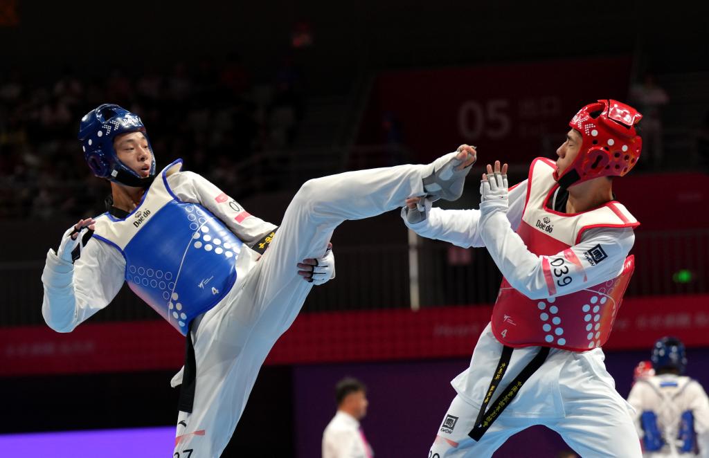 9月27日,杭州亞運(yùn)會(huì)跆拳道男子80公斤級(jí)比賽中,崔陽(yáng)(左)在1/16淘汰賽中戰(zhàn)勝中國(guó)香港選手譚政南。新華社記者江文耀攝