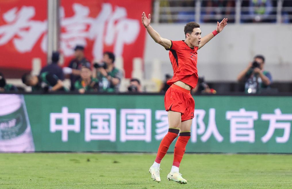 6月6日,首次代表國家隊出場的中國隊球員拜合拉木在進球后慶祝。新華社記者 賈浩成 攝