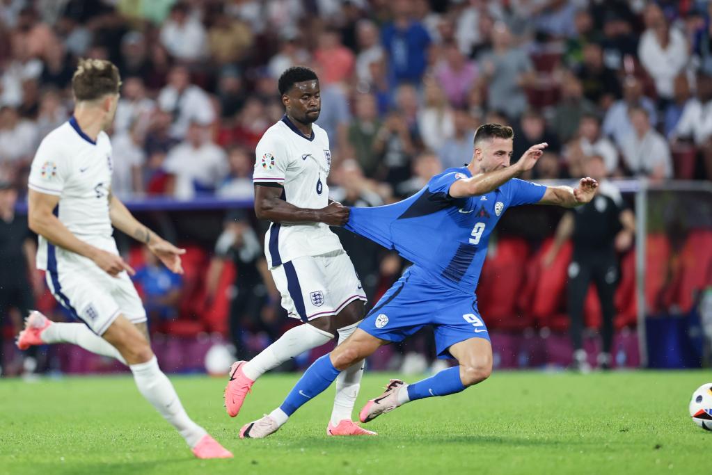 6月25日,英格蘭隊(duì)球員格希(中)在比賽中犯規(guī)。當(dāng)日,在德國(guó)科隆進(jìn)行的2024歐洲足球錦標(biāo)賽C組第三輪比賽中,英格蘭隊(duì)0比0戰(zhàn)平斯洛文尼亞隊(duì)。新華社記者 白雪飛 攝