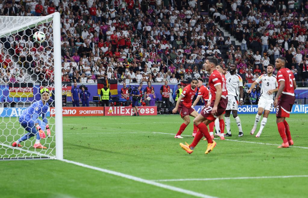 6月23日,德國(guó)隊(duì)球員菲爾克魯格(右二)破門得分。當(dāng)日,在德國(guó)法蘭克福進(jìn)行的2024歐洲足球錦標(biāo)賽A組第三輪比賽中,德國(guó)隊(duì)1比1戰(zhàn)平瑞士隊(duì)。新華社記者 白雪飛 攝