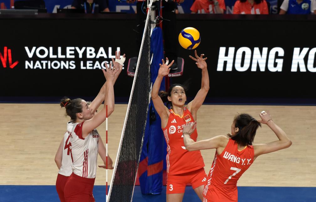 6月16日,中國隊球員刁琳宇(右二)在比賽中傳球。當日,在世界女排聯(lián)賽中國香港站比賽中,中國隊3比0戰(zhàn)勝波蘭隊。新華社記者 盧炳輝 攝