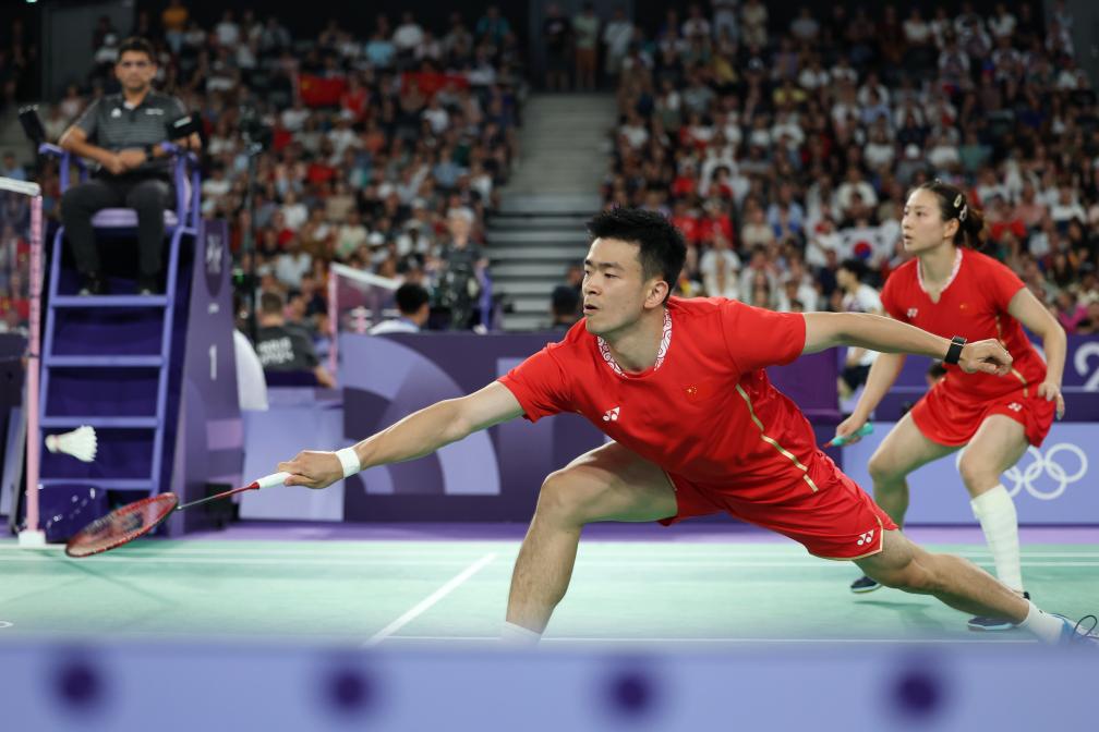 8月1日,中國(guó)組合鄭思維(前)/黃雅瓊在羽毛球混合雙打半決賽中。新華社記者 陳斌 攝