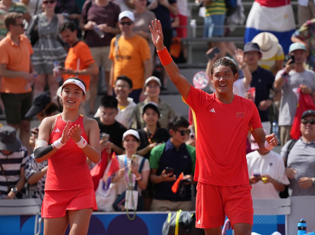 8月1日,王欣瑜/張之臻在網(wǎng)球混合雙打半決賽后慶祝。新華社記者 萬(wàn)象 攝