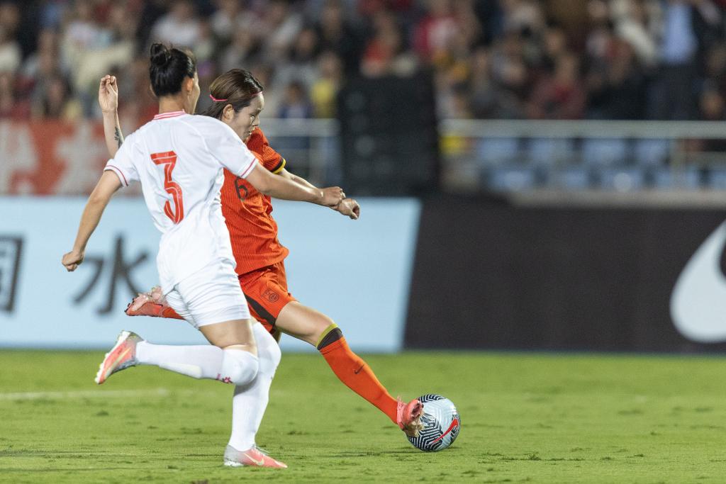 10月29日,中國隊(duì)球員張馨(右)在比賽中射門。新華社記者 黃偉 攝