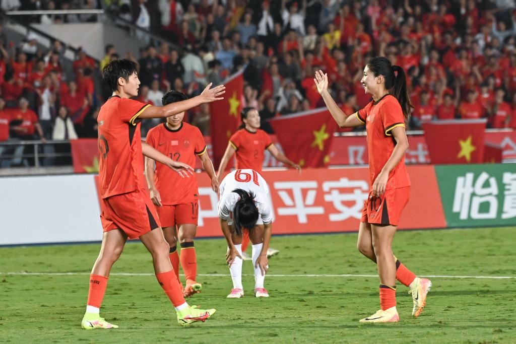 10月29日,中國隊(duì)球員袁叢(前左)和王妍雯(前右)慶祝進(jìn)球。新華社記者 張子彧 攝
