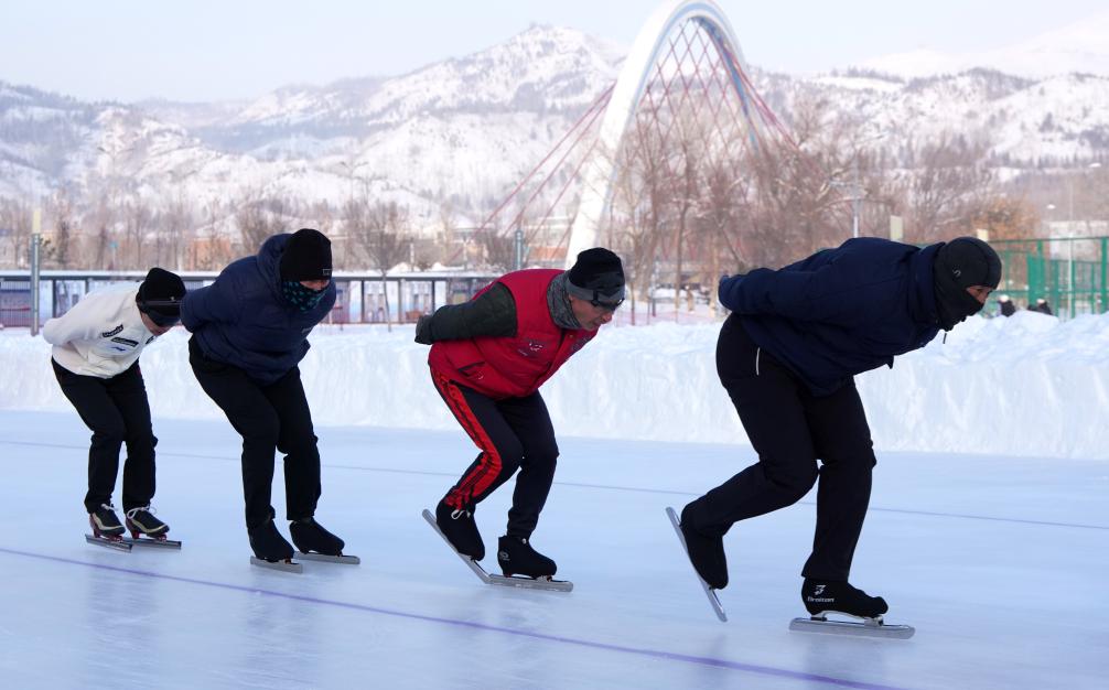 不一會(huì)兒,一群孩子涌入冰場,他們是阿勒泰市業(yè)余體校的小運(yùn)動(dòng)員,年齡8到15歲不等。他們脫下厚重的棉衣,換上連身服,開始在冰面上滑行,在教練的指揮下,時(shí)而沖刺,時(shí)而慢行調(diào)整,輕快的腳步讓“老朋友們”贊嘆,“這些小孩厲害啊,比我們那會(huì)兒強(qiáng)多了”。