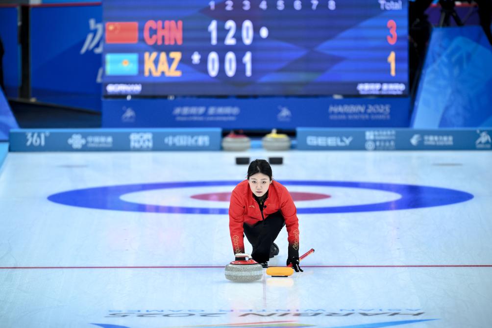 2月4日,中國隊選手韓雨在比賽中擲壺。新華社記者 江漢 攝