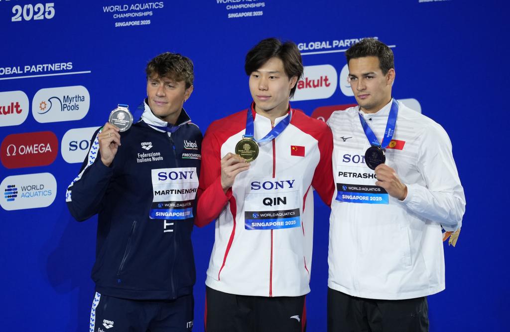 7月28日,冠軍中國選手覃海洋(中)、亞軍意大利選手馬丁嫩吉(左)和季軍吉爾吉斯斯坦選手彼得拉紹夫在頒獎儀式上。新華社記者 伍志尊 攝