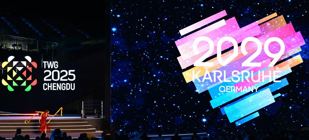 這是8月17日拍攝的閉幕式現(xiàn)場。新華社記者 貝赫 攝 各代表團(tuán)旗幟和運(yùn)動員代表入場,全場觀眾以熱烈的掌聲和歡呼聲,向奮力拼搏的體育健兒們致以祝賀和敬意。 成都世運(yùn)會組委會主席施小琳、國際世界運(yùn)動會協(xié)會主席何塞·佩魯雷納先后致辭,向為本屆世運(yùn)會圓滿成功作出貢獻(xiàn)的所有人員表示感謝。下屆世運(yùn)會舉辦城市德國卡爾斯魯厄市市長弗蘭克·門特魯普致辭,熱情邀請全球賓客四年后相聚卡爾斯魯厄。