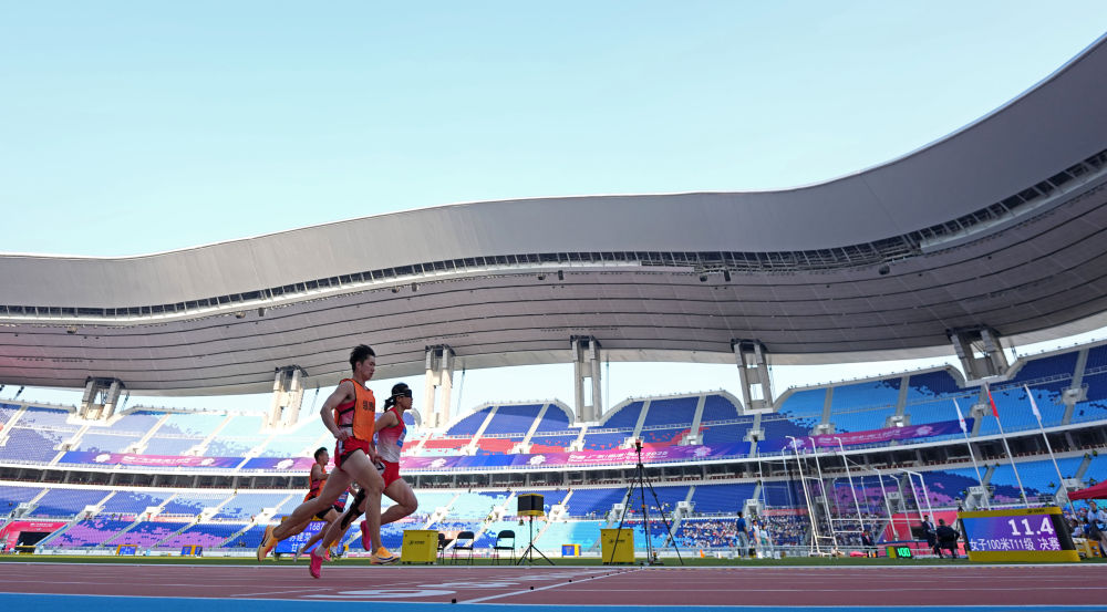 當(dāng)日,伴隨著提振人心的醒獅表演,田徑、聾人籃球等項目都在簡短的開賽儀式后進入競賽環(huán)節(jié)。在廣東省奧體中心體育場舉行的田徑比賽傳來捷報,巴黎殘奧會兩銀得主、山東選手郭芊芊在女子400米T35級比賽中,以超世界紀(jì)錄、破全國紀(jì)錄的1分14秒65率先沖線。兩屆殘奧會冠軍、陜西隊的董飛霞在女子鉛球F55級比賽中摘下桂冠。在她的鼓勵下,陜西隊當(dāng)天一共獲得6枚田徑金牌。