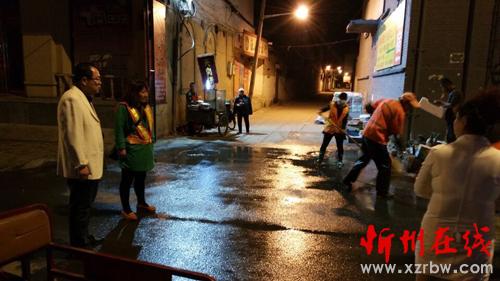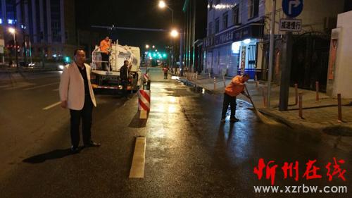 寂靜的夜晚伴隨著酒水車的轟鳴聲一股股清澈的水流噴灑在馬路上,街頭沉現(xiàn)著一個(gè)個(gè)揮舞著掃帚的橙黃色身影,點(diǎn)綴的忻州城區(qū)的夜色更加靚麗。