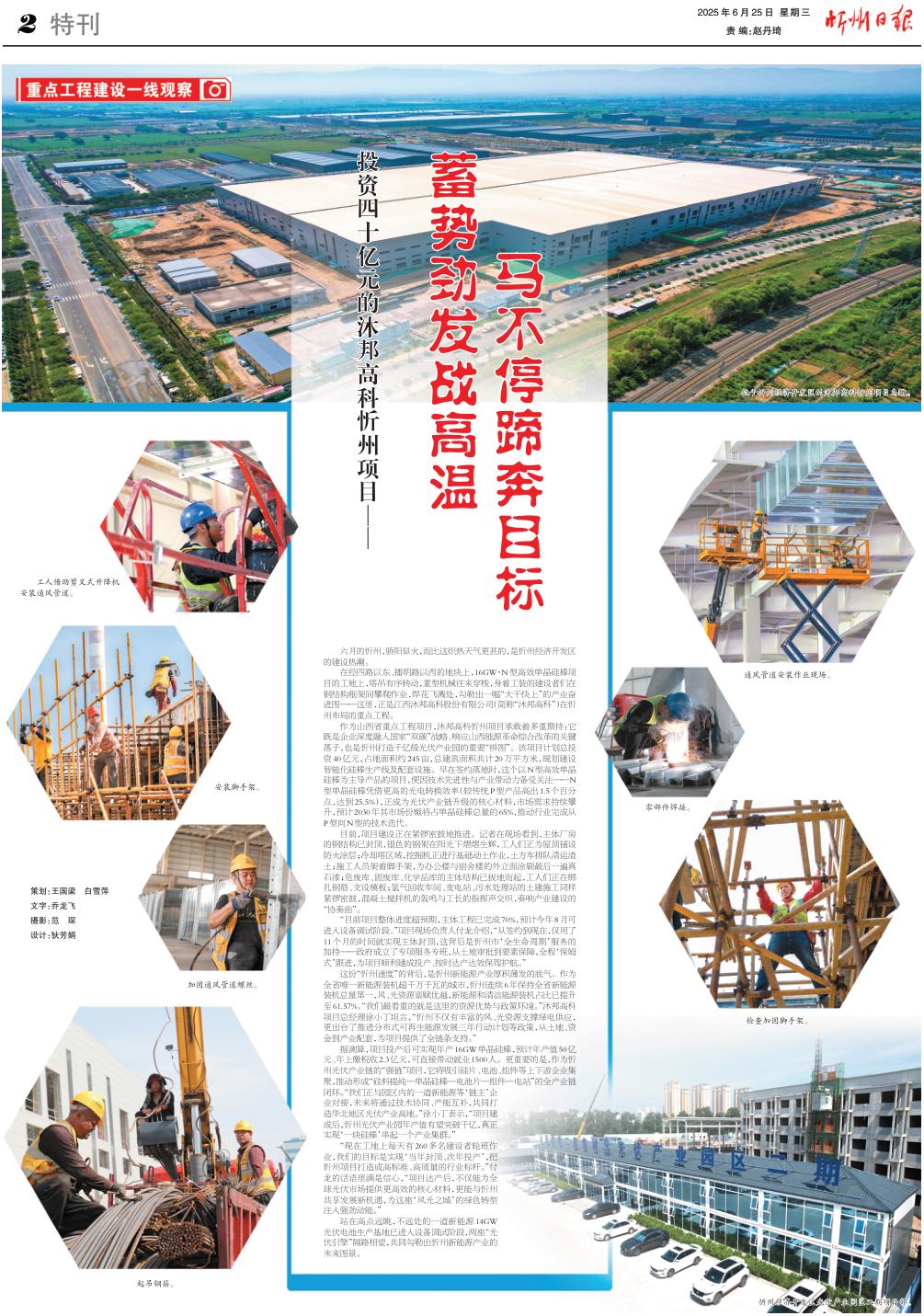 “現在工地上每天有260多名建設者輪班作業(yè),我們的目標是實現‘當年封頂、次年投產’,把忻州項目打造成高標準、高質量的行業(yè)標桿?!备洱埖脑捳Z里滿是信心,“項目達產后,不僅能為全球光伏市場提供更高效的核心材料,更能與忻州共享發(fā)展新機遇,為這座‘風光之城’的綠色轉型注入強勁動能?!?/p>