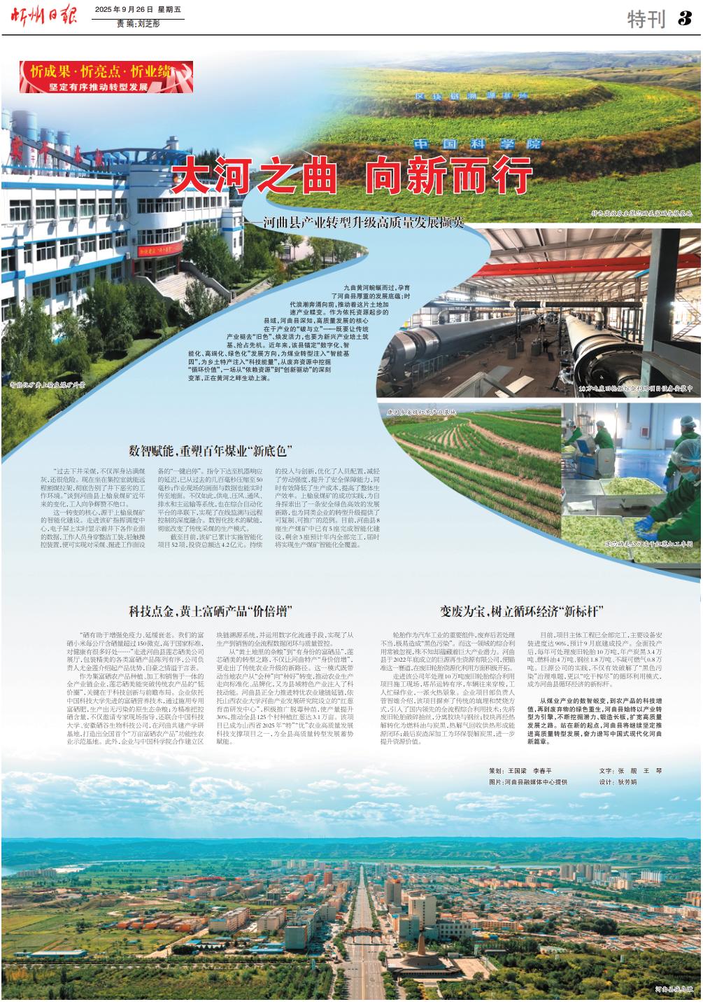九曲黃河蜿蜒而過,孕育了河曲縣厚重的發(fā)展底蘊;時代浪潮奔涌向前,推動著這片土地加速產(chǎn)業(yè)蝶變。作為依托資源起步的縣域,河曲縣深知,高質(zhì)量發(fā)展的核心在于產(chǎn)業(yè)的“破與立”——既要讓傳統(tǒng)產(chǎn)業(yè)褪去“舊色”、煥發(fā)活力,也要為新興產(chǎn)業(yè)培土筑基、搶占先機。近年來,該縣錨定“數(shù)字化、智能化、高端化、綠色化”發(fā)展方向,為煤業(yè)轉(zhuǎn)型注入“智能基因”,為鄉(xiāng)土特產(chǎn)注入“科技能量”,從廢棄資源中挖掘“循環(huán)價值”,一場從“依賴資源”到“創(chuàng)新驅(qū)動”的深刻變革,正在黃河之畔生動上演。 數(shù)智賦能,重塑百年煤業(yè)“新底色” “過去下井采煤,不僅渾身沾滿煤灰,還很危險?,F(xiàn)在坐在集控室就能遠程割煤拉架,徹底告別了井下惡劣的工作環(huán)境?!闭劦胶忧h上榆泉煤礦近年來的變化,工人向爭輝贊不絕口。 這一轉(zhuǎn)變的核心,源于上榆泉煤礦的智能化建設。走進該礦指揮調(diào)度中心,電子屏上實時顯示著井下各作業(yè)面的數(shù)據(jù),工作人員身穿整潔工裝,輕觸操控裝置,便可實現(xiàn)對采煤、掘進工作面設備的“一鍵啟停”。指令下達至機器響應的延遲,已從過去的幾百毫秒壓縮至50毫秒;作業(yè)現(xiàn)場的畫面與數(shù)據(jù)也能實時傳至地面。不僅如此,供電、壓風、通風、排水和主運輸?shù)认到y(tǒng),也在綜合自動化平臺的串聯(lián)下,實現(xiàn)了在線監(jiān)測與遠程控制的深度融合。數(shù)智化技術的賦能,徹底改變了傳統(tǒng)采煤的生產(chǎn)模式。 截至目前,該礦已累計實施智能化項目52項,投資總額達4.2億元。持續(xù)的投入與創(chuàng)新,優(yōu)化了人員配置,減輕了勞動強度,提升了安全保障能力,同時有效降低了生產(chǎn)成本,提高了整體生產(chǎn)效率。上榆泉煤礦的成功實踐,為自身探索出了一條安全綠色高效的發(fā)展新路,也為同類企業(yè)的轉(zhuǎn)型升級提供了可復制、可推廣的范例。目前,河曲縣8座生產(chǎn)煤礦中已有5座完成智能化建設,剩余3座預計年內(nèi)全部完工,屆時將實現(xiàn)生產(chǎn)煤礦智能化全覆蓋。 科技點金,黃土富硒產(chǎn)品“價倍增” “硒有助于增強免疫力、延緩衰老。我們的富硒小米每公斤含硒量超過150微克,高于國家標準,對健康有很多好處……”走進河曲縣蓮芯硒美公司展廳,包裝精美的各類富硒產(chǎn)品陳列有序,公司負責人尤金蓮介紹起產(chǎn)品優(yōu)勢,自豪之情溢于言表。 作為集富硒農(nóng)產(chǎn)品種植、加工和銷售于一體的全產(chǎn)業(yè)鏈企業(yè),蓮芯硒美能突破傳統(tǒng)農(nóng)產(chǎn)品的“低價圈”,關鍵在于科技創(chuàng)新與前瞻布局。企業(yè)依托中國科技大學先進的富硒營養(yǎng)技術,通過施用專用富硒肥,生產(chǎn)出無污染的原生態(tài)雜糧;為精準把控硒含量,不僅邀請專家現(xiàn)場指導,還聯(lián)合中國科技大學、安徽硒谷生物科技公司,在河曲共建產(chǎn)學研基地,打造出全國首個“萬畝富硒農(nóng)產(chǎn)品”功能性農(nóng)業(yè)示范基地。此外,企業(yè)與中國科學院合作建立區(qū)塊鏈溯源系統(tǒng),并運用數(shù)字化流通手段,實現(xiàn)了從生產(chǎn)到銷售的全流程數(shù)據(jù)閉環(huán)與質(zhì)量管控。 從“黃土地里的雜糧”到“有身份的富硒品”,蓮芯硒美的轉(zhuǎn)型之路,不僅讓河曲特產(chǎn)“身價倍增”,更走出了傳統(tǒng)農(nóng)業(yè)升級的新路徑。這一模式既帶動當?shù)剞r(nóng)戶從“會種”向“種好”轉(zhuǎn)變,推動農(nóng)業(yè)生產(chǎn)走向標準化、品牌化,又為縣域特色產(chǎn)業(yè)注入了科技動能。河曲縣正全力推進特優(yōu)農(nóng)業(yè)建鏈延鏈,依托山西農(nóng)業(yè)大學河曲產(chǎn)業(yè)發(fā)展研究院設立的“紅蔥育苗研發(fā)中心”,積極推廣脫毒種苗,使產(chǎn)量提升30%,推動全縣125個村種植紅蔥達3.1萬畝。該項目已成為山西省2025年“特”“優(yōu)”農(nóng)業(yè)高質(zhì)量發(fā)展科技支撐項目之一,為全縣高質(zhì)量轉(zhuǎn)型發(fā)展蓄勢賦能。 變廢為寶,樹立循環(huán)經(jīng)濟“新標桿” 輪胎作為汽車工業(yè)的重要組件,廢棄后若處理不當,極易造成“黑色污染”。而這一領域的綜合利用常被忽視,殊不知卻蘊藏著巨大產(chǎn)業(yè)潛力。河曲縣于2022年底成立的巨源再生資源有限公司,便瞄準這一賽道,在廢舊輪胎資源化利用方面積極開拓。 走進該公司年處理10萬噸廢舊輪胎綜合利用項目施工現(xiàn)場,塔吊運轉(zhuǎn)有序,車輛往來穿梭,工人忙碌作業(yè),一派火熱景象。企業(yè)項目部負責人菅智雄介紹,該項目摒棄了傳統(tǒng)的填埋和焚燒方式,引入了國內(nèi)領先的全流程綜合利用技術:先將廢舊輪胎破碎抽絲,分離膠塊與鋼絲;膠塊再經(jīng)熱解轉(zhuǎn)化為燃料油與炭黑,熱解氣回收供熱形成能源閉環(huán);最后炭渣深加工為環(huán)保裂解炭黑,進一步提升資源價值。 目前,項目主體工程已全部完工,主要設備安裝進度達90%,預計9月底建成投產(chǎn)。全面投產(chǎn)后,每年可處理廢舊輪胎10萬噸,年產(chǎn)炭黑3.4萬噸、燃料油4萬噸、鋼絲1.8萬噸、不凝可燃氣0.8萬噸。巨源公司的實踐,不僅有效破解了“黑色污染”治理難題,更以“吃干榨盡”的循