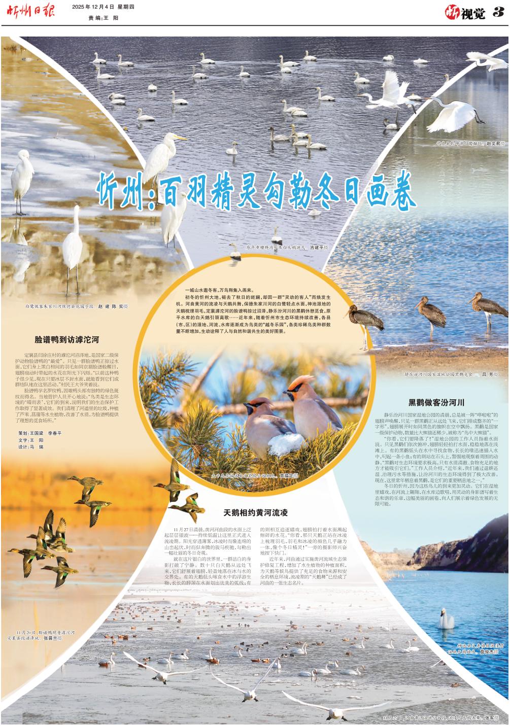 初冬的忻州大地,褪去了秋日的斑斕,卻因一群“靈動(dòng)的客人”而煥發(fā)生機(jī)。河曲黃河的流凌與天鵝共舞,保德朱家川河的白鷺輕點(diǎn)水面,神池濕地的天鵝梳理羽毛,定襄滹沱河的臉譜鴨掠過沼澤,靜樂汾河川的黑鸛休憩覓食,原平水庫(kù)的白天鵝引頸高歌……近年來,隨著忻州市生態(tài)環(huán)境持續(xù)改善,各縣(市、區(qū))的濕地、河流、水庫(kù)逐漸成為鳥類的“越冬樂園”,各類珍稀鳥類種群數(shù)量不斷增加,生動(dòng)詮釋了人與自然和諧共生的美好圖景。