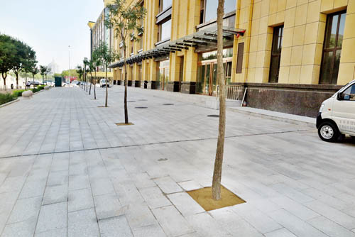 據(jù)了解,因?yàn)樵撆R街大樓是轉(zhuǎn)角建筑,相鄰七一路樓前還栽有13棵景觀樹,工人們將在7日下午為這些樹木切割設(shè)置相同規(guī)格的樹池。圖為有了澆水池的樹木(魯明強(qiáng))