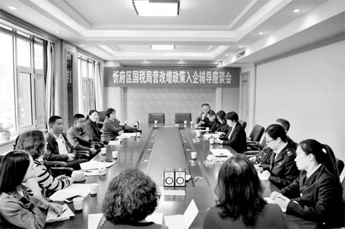 本報訊 4月19日下午,忻府區(qū)國稅局營改增政策入企輔導座談會在忻州國力房地產開發(fā)有限公司會議室召開。區(qū)局黨組書記、局長郭靜出席,政策法規(guī)科科長王繼紅主持會議,稅源管理科負責人和房地產企業(yè)代表一同參加。