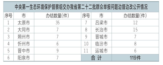 中央第一生態(tài)環(huán)境保護督察組交辦我省第二十二批群眾舉報問題119件,辦結119件。公示119件,其中太原市35件、大同市7件、朔州市7件、忻州市6件、晉中市9件、陽泉市7件、呂梁市12件、長治市15件、晉城市7件、臨汾市8件、運城市6件??傻卿浬轿魇∪嗣裾W(wǎng)站或掃描二維碼查閱群眾信訪舉報轉辦和邊督邊改公開情況一覽表。