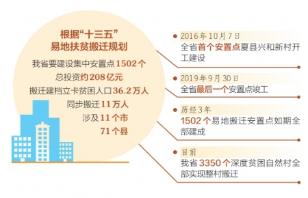 “十三五”易地扶貧搬遷啟動以來,我省有36.2萬貧困人口告別山莊窩鋪,搬進了公共設施配套齊全、產業(yè)就業(yè)措施完善的1502個易地扶貧搬遷集中安置點,這些安置點已成為貧困群眾穩(wěn)定脫貧的新起點、走向全面小康的新支點、實現(xiàn)鄉(xiāng)村振興的新亮點。