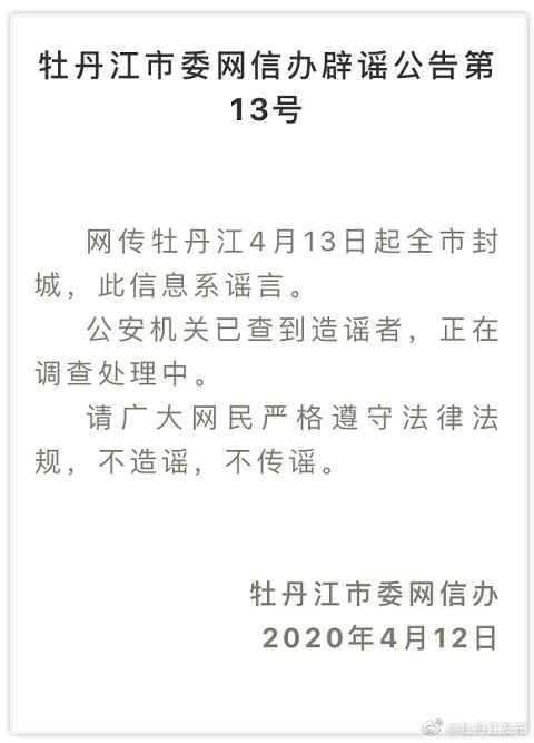 網(wǎng)傳牡丹江4月13日起全市封城,此信息系謠言。公安機關(guān)已查到造謠者,正在調(diào)查處理中。請廣大網(wǎng)民嚴格遵守法律法規(guī),不造謠,不傳謠。