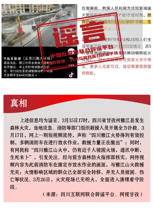 為博流量炮制安全類謠言,引發(fā)恐慌。春季歷來(lái)是森林火災(zāi)高發(fā)時(shí)段。加之開春后,工廠企業(yè)復(fù)產(chǎn)復(fù)工,致災(zāi)因素明顯增多。3月,全國(guó)多地發(fā)生火災(zāi)事故,一些網(wǎng)民為蹭熱點(diǎn)、博流量,趁機(jī)編織謠言,引發(fā)公眾恐慌。3月中旬,四川省甘孜州雅江縣發(fā)生森林火災(zāi),在當(dāng)?shù)貞?yīng)急、消防等部門組織救援人員全力撲救之際,卻有人編造“四川雅江山火救援力量正在撤出”“雅江仍有近千人被困火場(chǎng)”“雅江山火有三名撲火人員犧牲”等失實(shí)信息,嚴(yán)重干擾災(zāi)害應(yīng)急響應(yīng)和救援工作?!爸貞c南坪商業(yè)大樓火災(zāi)傷亡慘重”“湖南省長(zhǎng)沙市天心區(qū)發(fā)生重大刑案,警方發(fā)布懸賞通告”“天津一銀行發(fā)生搶劫”等嚴(yán)重失實(shí)的涉公共安全類視頻流傳網(wǎng)絡(luò),或是造謠者自編自導(dǎo),或是利用AI技術(shù)偽造,卻引發(fā)群眾恐慌、造成惡劣影響。此外,“綠得發(fā)黑的菠菜不能吃”“清明蔗、毒過(guò)蛇”等食品安全類謠言,則是利用了時(shí)令和人們對(duì)食物中毒的擔(dān)憂情緒,夸大其詞、危言聳聽,目的都是販賣焦慮、制造恐慌,進(jìn)而吸引眼球、騙取流量。