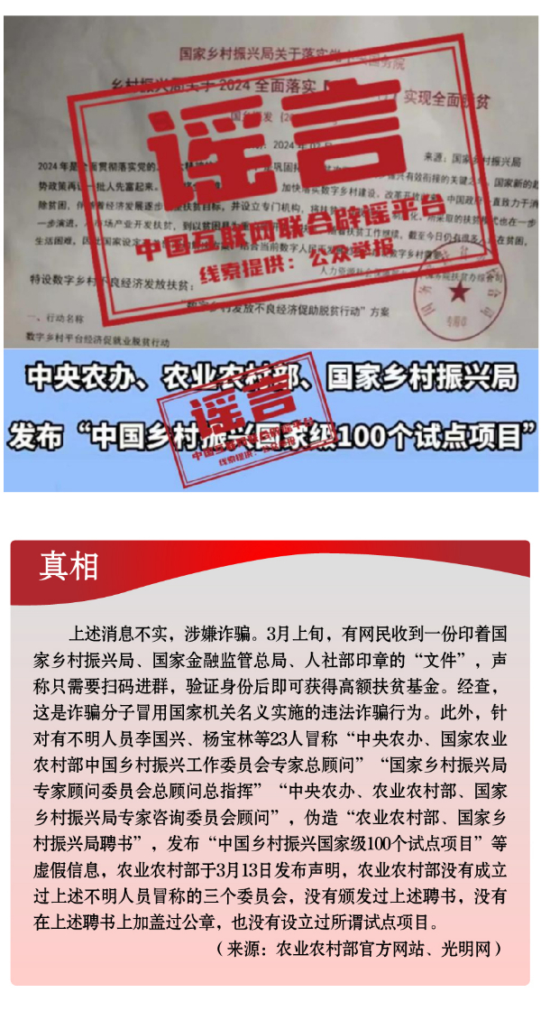 假冒權(quán)威杜撰政策類謠言,誤導(dǎo)公眾。3月以來(lái),一些不法分子或機(jī)構(gòu)打著權(quán)威旗號(hào),假冒國(guó)家機(jī)關(guān)、偽造政府公文、歪曲解讀政策,企圖行騙牟利。如,詐騙分子冒用國(guó)家機(jī)關(guān)名義,假稱“國(guó)家發(fā)放2024年鄉(xiāng)村振興扶貧補(bǔ)貼”“鄉(xiāng)村振興項(xiàng)目有國(guó)家級(jí)試點(diǎn)100個(gè)”“‘退稅綠色通道’加快退稅到賬速度”等,實(shí)施違法詐騙行為,給社會(huì)公眾造成極大信息和資金安全風(fēng)險(xiǎn)。還有人制造、傳播“我國(guó)城鄉(xiāng)居民醫(yī)保參保人數(shù)近年來(lái)持續(xù)下降,部分地區(qū)農(nóng)村出現(xiàn)醫(yī)保退保潮”“失業(yè)保險(xiǎn)金只能領(lǐng)一次,最多領(lǐng)24個(gè)月”“我國(guó)社?;鹑冀唤o外資機(jī)構(gòu)管理”等一系列與事實(shí)嚴(yán)重不符的涉公共謠言,迷惑性大、蠱惑性強(qiáng),極易誤導(dǎo)公眾,對(duì)我國(guó)現(xiàn)有社保政策和相關(guān)工作造成負(fù)面影響。