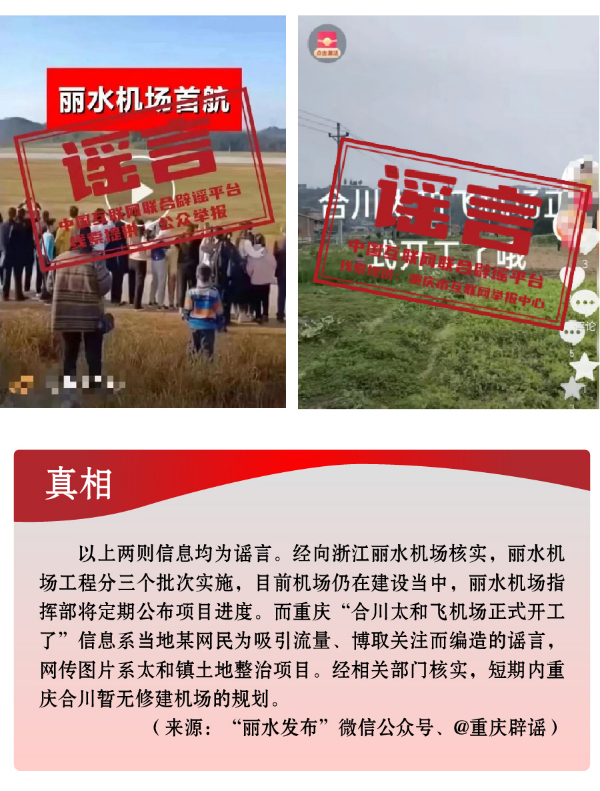 搭蹭熱點(diǎn)散播民生類謠言,渲染焦慮。3月,全國(guó)兩會(huì)召開,“民生清單”熱度高?!按赫小薄按河巍钡葧r(shí)間節(jié)點(diǎn),有關(guān)招工就業(yè)、疫病傳染等內(nèi)容也成為個(gè)別網(wǎng)民博眼球的素材。一些個(gè)人或自媒體歪曲甚或虛構(gòu)事實(shí),編造散布社會(huì)民生謠言,引發(fā)公眾不必要的焦慮。如,別有用心者惡意虛構(gòu)事實(shí),發(fā)布“重慶80%的工廠暫停招聘”“湖南郴州疫情卷土重來(lái)”等虛假信息,渲染負(fù)面情緒、徒增公眾憂慮、擾亂社會(huì)秩序;還有人為吸引流量、博取關(guān)注,根據(jù)主觀臆想,采取移花接木等手段,散播“京滬高速公路停止收費(fèi)”“浙江麗水機(jī)場(chǎng)已建成投用并首航”“重慶合川太和飛機(jī)場(chǎng)正式開建”等涉重大基礎(chǔ)設(shè)施建設(shè)項(xiàng)目的假消息,誤導(dǎo)公眾認(rèn)知,擾亂群眾交通出行秩序。