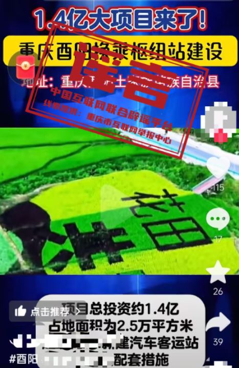 真相:近日,有網(wǎng)民發(fā)布信息稱“1.4億大項(xiàng)目來(lái)了,重慶酉陽(yáng)換乘樞紐站建設(shè),新建汽車客運(yùn)站及相關(guān)配套”,引發(fā)關(guān)注。經(jīng)重慶市酉陽(yáng)縣交通運(yùn)輸委核實(shí),酉陽(yáng)縣正在推進(jìn)桃花源景區(qū)游客集散中心提升項(xiàng)目,暫無(wú)“1.4億建設(shè)換乘樞紐站”項(xiàng)目,網(wǎng)傳信息系謠言。(來(lái)源:“重慶辟謠”微信公眾號(hào))