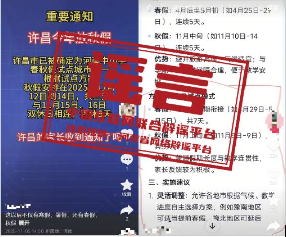 真相:近日,河南、安徽部分自媒體平臺發(fā)布關(guān)于中小學(xué)春秋放假的信息,聲稱“許昌市已被確定為河南中小學(xué)春秋假試點(diǎn)城市之一”“周口市中小學(xué)2025年秋假時(shí)間安排如下”“蕪湖市中小學(xué)將在11月12日至14日放首個(gè)秋假,連周末共5天”,引發(fā)關(guān)注。對此,河南許昌、周口及安徽蕪湖教育部門作出回應(yīng):并無放秋假的安排,網(wǎng)傳消息均為謠言。中小學(xué)放假安排需嚴(yán)格遵循國家教育方針政策及當(dāng)?shù)亟逃块T的統(tǒng)一部署,結(jié)合本地教育教學(xué)實(shí)際統(tǒng)籌規(guī)劃。如需了解相關(guān)安排,請通過屬地教育部門官方網(wǎng)站,切勿輕信、傳播未經(jīng)官方確認(rèn)的“小道消息”。(來源:“清朗河南”微信公眾號、@大河網(wǎng)、安徽網(wǎng)絡(luò)辟謠平臺)