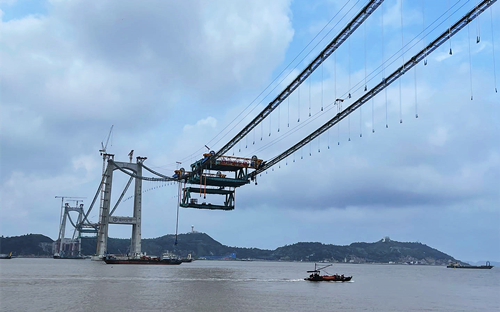 “大橋主梁最大節(jié)段重量達到813噸,國內(nèi)現(xiàn)有纜載吊機根本無法滿足單臺起吊需求。”潘濟向記者表示,為解決這一難題,項目創(chuàng)新研制國內(nèi)首套1000噸級纜載吊機,搭載人機界面、傳感器技術、通訊技術等技術,把安裝精度誤差控制在5毫米內(nèi),確保施工過程安全高效。