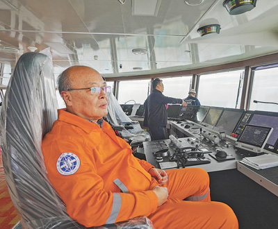 “夢想”號指揮部主要負責(zé)人周昶(前)在動力控制室查看船上情況。 中國地質(zhì)調(diào)查局宣傳教育中心供圖