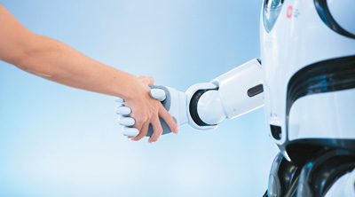 在深圳市優(yōu)必選科技股份有限公司總部,工作人員與熊貓機器人“優(yōu)悠”握手。新華社記者 毛思倩攝