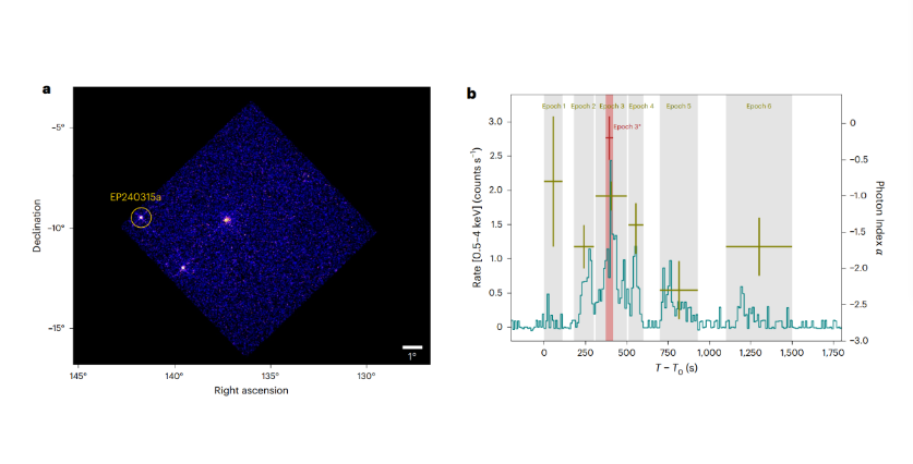 我國“天關(guān)”衛(wèi)星(愛因斯坦探針衛(wèi)星)觀測到一例產(chǎn)生于約125億光年之外的伽馬暴EP240315a,這是人類首次探測到宇宙早期爆發(fā)現(xiàn)象的軟X射線信號,將為開展早期宇宙相關(guān)研究開啟一扇新窗口。相關(guān)成果論文23日在國際學(xué)術(shù)期刊《自然·天文》在線發(fā)表。