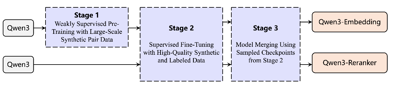向量模型像是AI的“翻譯器”,它可以將文本、圖片等人類(lèi)可認(rèn)知的非結(jié)構(gòu)化信息,映射到機(jī)器更易理解的向量空間,再基于這些向量實(shí)現(xiàn)高效的信息分類(lèi)、檢索或排序。也正因此,向量模型對(duì)于提升AI的語(yǔ)義理解、信息檢索、多模態(tài)融合等核心能力至關(guān)重要。基于千問(wèn)3模型,通義團(tuán)隊(duì)通過(guò)對(duì)比訓(xùn)練、SFT、模型融合等方法,打造出全新的千問(wèn)3向量模型,包含文本嵌入模型 Qwen3-Embedding以及文本排序模型Qwen3-Reranker。