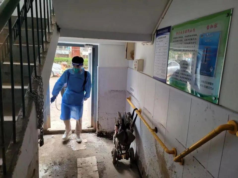 “益行志愿服務(wù)隊(duì)從8月4日17點(diǎn)下班后開始組織救災(zāi)工作,到凌晨24點(diǎn)充分準(zhǔn)備完畢。總計(jì)出動9輛汽車,志愿者們對社區(qū)內(nèi)的一樓單元門口、垃圾分類驛站、居民家里、黨群活動中心、居委會物資庫、社區(qū)花園內(nèi)和道路,開展清理淤泥和清洗路面工作?!睆垈惤榻B道。
