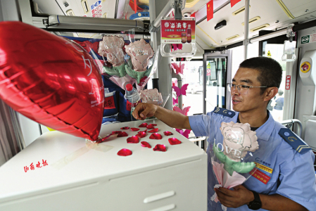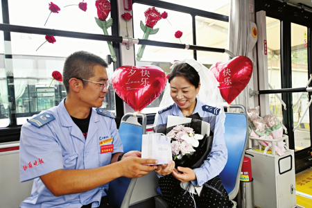 七夕節(jié)即將到來,8月8日,在太原公交第三汽車分公司,公交車廂里上演了一場(chǎng)別樣的浪漫——堅(jiān)守在一線的兩名公交司機(jī)閻樹德和焦更新,分別為出車回來的妻子準(zhǔn)備了大大的驚喜。用送花、提前準(zhǔn)備飯菜、布置車廂等行動(dòng)表達(dá)自己的愛意。