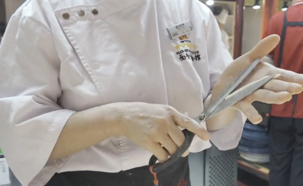 圖為夾心面。新華社記者 王怡靜 攝??關于剪刀面的故事很動人——“‘剪子面,兩頭尖,吃到肚里胃不酸’。相傳剪刀面是以前喬家大院的喬貴發(fā)走西口的時候,留在家里的妻子為丈夫裁剪衣服,由于過于思念丈夫,一走神就把剪刀也帶到了廚房里,于是便有了剪子面。‘胃不酸’,其實也是‘心不酸’?!崩铉f。剪刀面一般用來做湯面,配蔬菜吃,也有著希望家人安康的寄托。