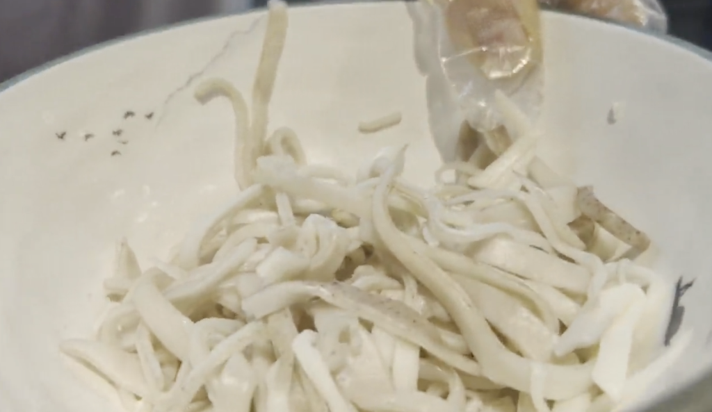 夾心面是一種小麥面裹高粱面的山西獨有的面食,外表看起來是小麥面粉的白色,但內(nèi)里卻是高粱面的紅色。“在以前物資匱乏的時候,吃白面(小麥面)是日子過得比較好的象征,對于大部分普通人家而言,如果不是什么特殊的日子都是吃紅面(高粱面)。有的人家就把紅面裹在白面里,為了顯示自己家日子過得挺好,也算是一種苦中作樂吧。”山西會館面食博物館文旅總監(jiān)李琨說?!暗浇裉?,已經(jīng)是‘倉廩實’,白面不是什么稀罕物了,大家吃這種面的目的已經(jīng)變成為了營養(yǎng)均衡,特意攝入一些粗糧了。”