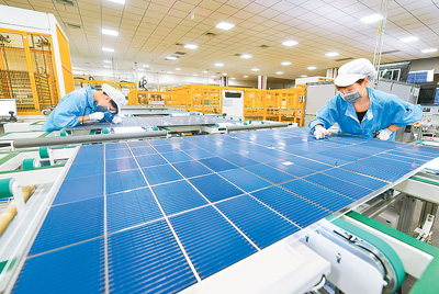 圖為安徽華晟新能源科技股份有限公司的異質(zhì)結(jié)光伏電池及組件工廠內(nèi),技術(shù)人員在對產(chǎn)品進(jìn)行檢測。徐 勇攝(新華社發(fā))
