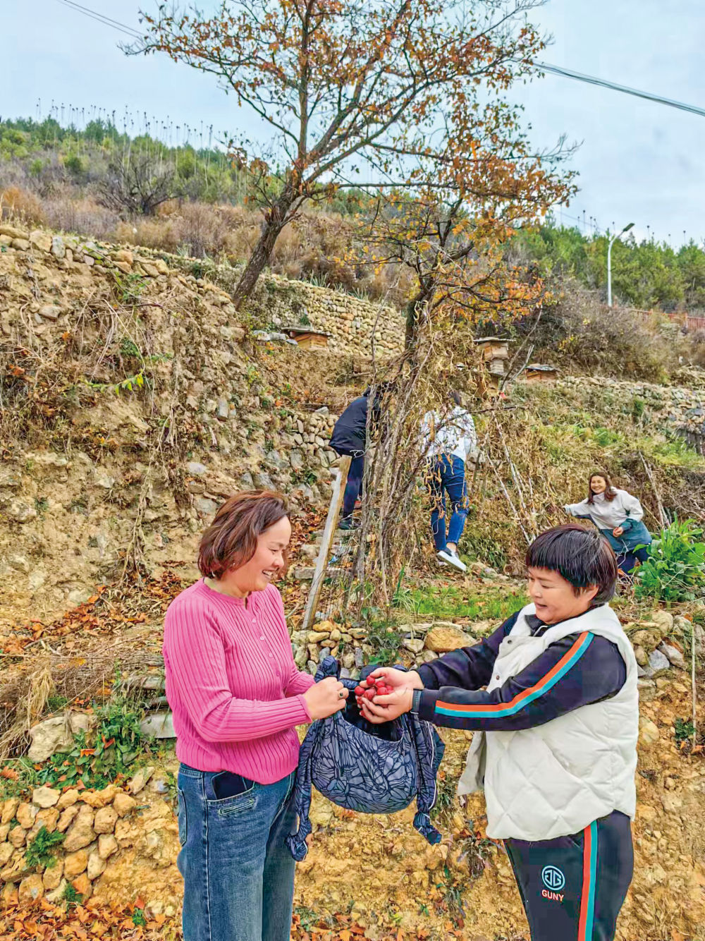 在松廟村的山坡上,一大早就從河南新鄉(xiāng)市長(zhǎng)垣市自駕車(chē)過(guò)來(lái)的馬女士(右)和朋友們一起采摘野生的山楂果子,她們每年夏天都要在這里小住幾天避暑。新華每日電訊記者 趙東輝 攝。