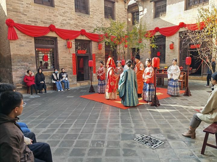 隨著演員齊聲吟誦,古院落中,一場(chǎng)明制出閣禮正在上演。不大的小院擠滿(mǎn)了觀禮游客,院外不少人沒(méi)擠進(jìn)來(lái),還在踮腳朝里望。這里是山西省高平市河西鎮(zhèn)的喜鎮(zhèn)蘇莊景區(qū)。