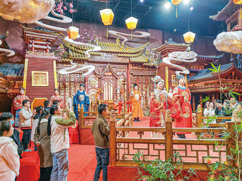 現(xiàn)在村里不僅可以提供周、漢、唐、宋、明等不同禮制的中式傳統(tǒng)婚禮服務(wù),景區(qū)日常還上演著迎賓禮、出閣禮、正婚禮等表演,讓客戶(hù)下單前就可以提前審視自己婚禮的效果。部分古民居經(jīng)過(guò)修繕裝修開(kāi)設(shè)的民宿,還分成了“男方院”“女方院”,方便全套迎親流程在這里展開(kāi)。