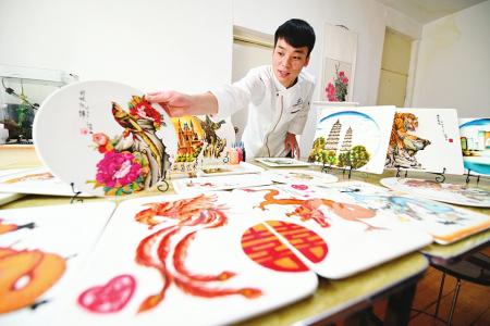 在阿峰工作室內(nèi),擺放著很多這幾年他精心制作的果醬畫作品,在方形和圓形的瓷盤上,有風(fēng)景、動物、建筑……每一幅都栩栩如生,不僅細膩美觀,還可食用?!捌饺绽铮页斯ぷ?,最喜歡在安靜的時候琢磨,有時為了一個作品要花上五六個小時來創(chuàng)作。果醬畫讓我大開眼界,不僅能畫出流暢的線條,還能畫出五彩斑斕的世界,更讓我找到了人生的目標?!卑⒎褰榻B。