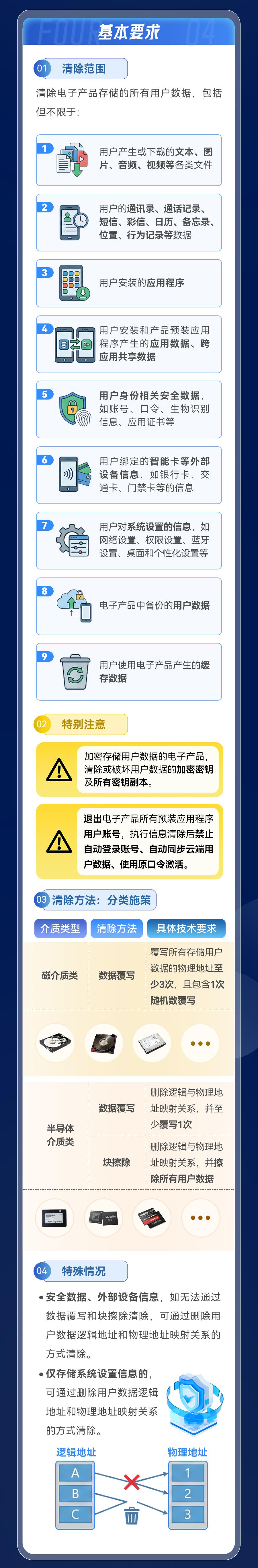 這項強制性國家標準的適用范圍涵蓋了在我國境內(nèi)生產(chǎn)、銷售的各類具有非易失性存儲介質(zhì)的電子產(chǎn)品,包括手機、平板電腦、筆記本電腦、臺式計算機,以及智能穿戴設(shè)備、辦公設(shè)備等。其約束對象既包括電子產(chǎn)品制造商、技術(shù)服務(wù)提供方,也包括二手電子產(chǎn)品回收經(jīng)營者。