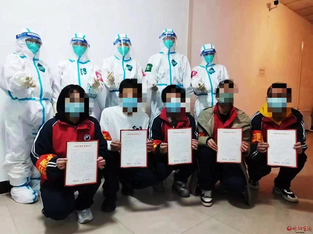 “大白”與方艙內(nèi)志愿者服務(wù)榮譽(yù)證書的獲得者在一起