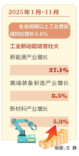 數(shù)據(jù)顯示,2025年1月—11月,全省規(guī)模以上工業(yè)增加值同比增長4.6%,工業(yè)新動(dòng)能培育壯大,新能源產(chǎn)業(yè)增長27.1%,高端裝備制造產(chǎn)業(yè)增長8.5%,新材料產(chǎn)業(yè)增長5.3%,為全省經(jīng)濟(jì)發(fā)展提供了堅(jiān)實(shí)支撐。