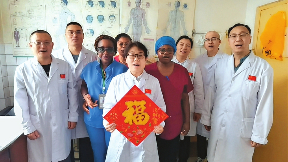 醫(yī)療隊(duì)隊(duì)員的辛勤付出,深深感動(dòng)著喀麥隆的醫(yī)護(hù)同行和患者。得知中國(guó)最重要的傳統(tǒng)節(jié)日——春節(jié)來臨,當(dāng)?shù)蒯t(yī)院的醫(yī)生和患者紛紛向隊(duì)員們送上真摯的祝福?!靶履昕鞓罚 薄爸x謝你們!”簡(jiǎn)單的話語,伴隨著友好的笑容和有力的握手,讓遠(yuǎn)離故土的隊(duì)員們感受到了家一般的溫暖。