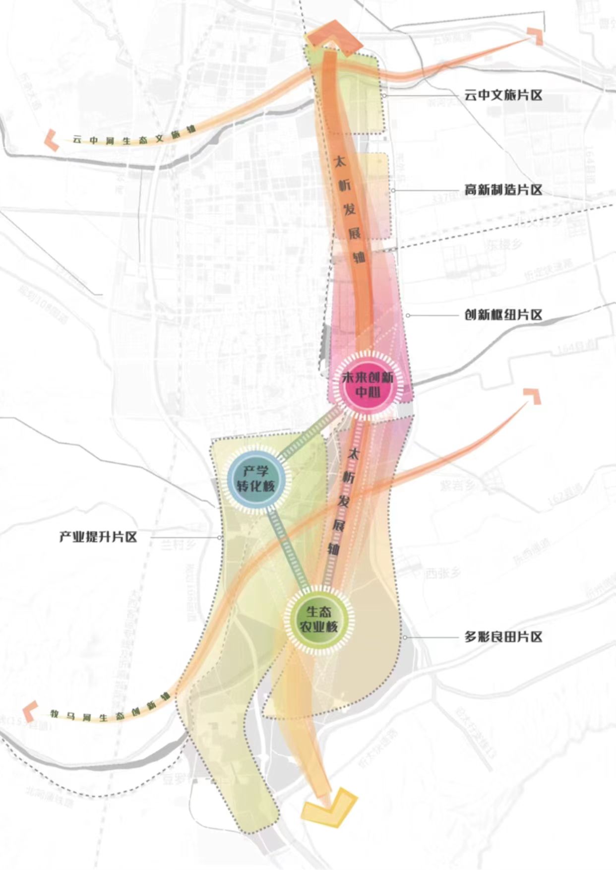 規(guī)劃面積約100平方公里,北至北外環(huán),南至石嶺關(太原界),西至北同蒲鐵路,東至東外環(huán)。新區(qū)作為太忻一體化經(jīng)濟區(qū)忻州片區(qū)的啟動區(qū),堅持生態(tài)優(yōu)先、綠色發(fā)展,統(tǒng)籌生活、生態(tài)、生產(chǎn)三大空間,以“一心雙核、三軸五片區(qū)”規(guī)劃布局,預留未來產(chǎn)業(yè)發(fā)展用地,重點發(fā)展雜糧產(chǎn)業(yè)、現(xiàn)代物流產(chǎn)業(yè)、新能源材料產(chǎn)業(yè)、文旅產(chǎn)業(yè)和科技創(chuàng)新智造產(chǎn)業(yè),北部打造高新制造集合體、云中河東段打造休閑度假文旅區(qū)、中部打造創(chuàng)新樞紐核心區(qū)、西南部打造產(chǎn)業(yè)提升區(qū)、東南部打造多彩良田示范區(qū),形成與大盂產(chǎn)業(yè)新城南北呼應之勢。