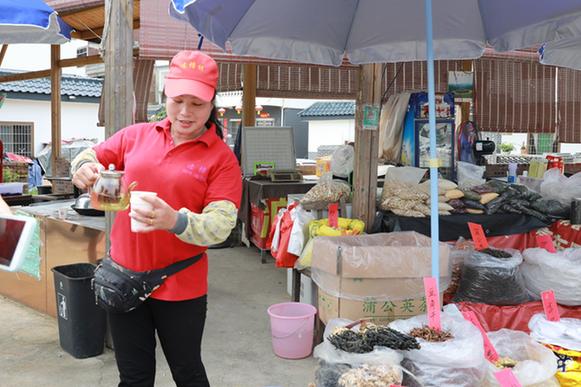 “天太熱,來喝口我這免費的茶?!辈湃脒B樟村村口,記者便被熱情的村民陸秀媚招呼到了自己的攤位。紅茶、本地枝葉、山柑皮、筍干……她的攤位琳瑯滿目,擺得滿滿當(dāng)當(dāng)。陸秀媚告訴記者,自己曾經(jīng)在市里賣童裝,剛開始還能掙到些錢,后來隨著網(wǎng)購興起,實體店的生意越來越難做。2018年,在習(xí)近平總書記來連樟村視察后,看到家鄉(xiāng)越變越好,陸秀媚選擇了回到村里創(chuàng)業(yè)。