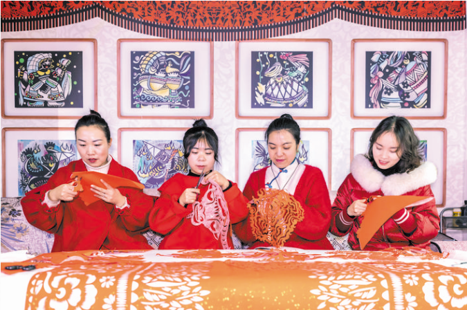 1月17日,岳紅霞(右二)帶領(lǐng)工作室學(xué)員創(chuàng)作“金牛送?!奔艏?。近日,曾獲全國剪紙大賽“金剪刀獎”、貴州省畢節(jié)市黔西縣非遺傳承人岳紅霞帶領(lǐng)工作室學(xué)員創(chuàng)作“金牛送?!毕盗兄黝}作品,迎接農(nóng)歷牛年。 (新華社發(fā) 范暉 攝)